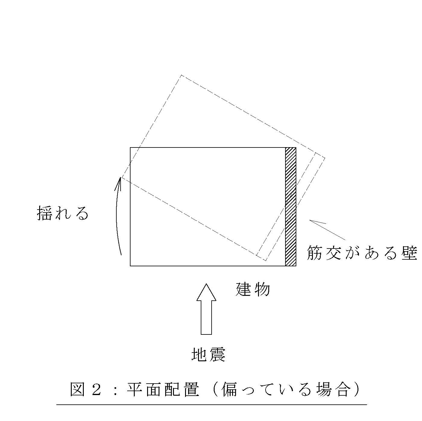例えばこの筋交を、平面的に、建物片方だけに筋交があるとすればどのようなことが起こるでしょうか(図2)。