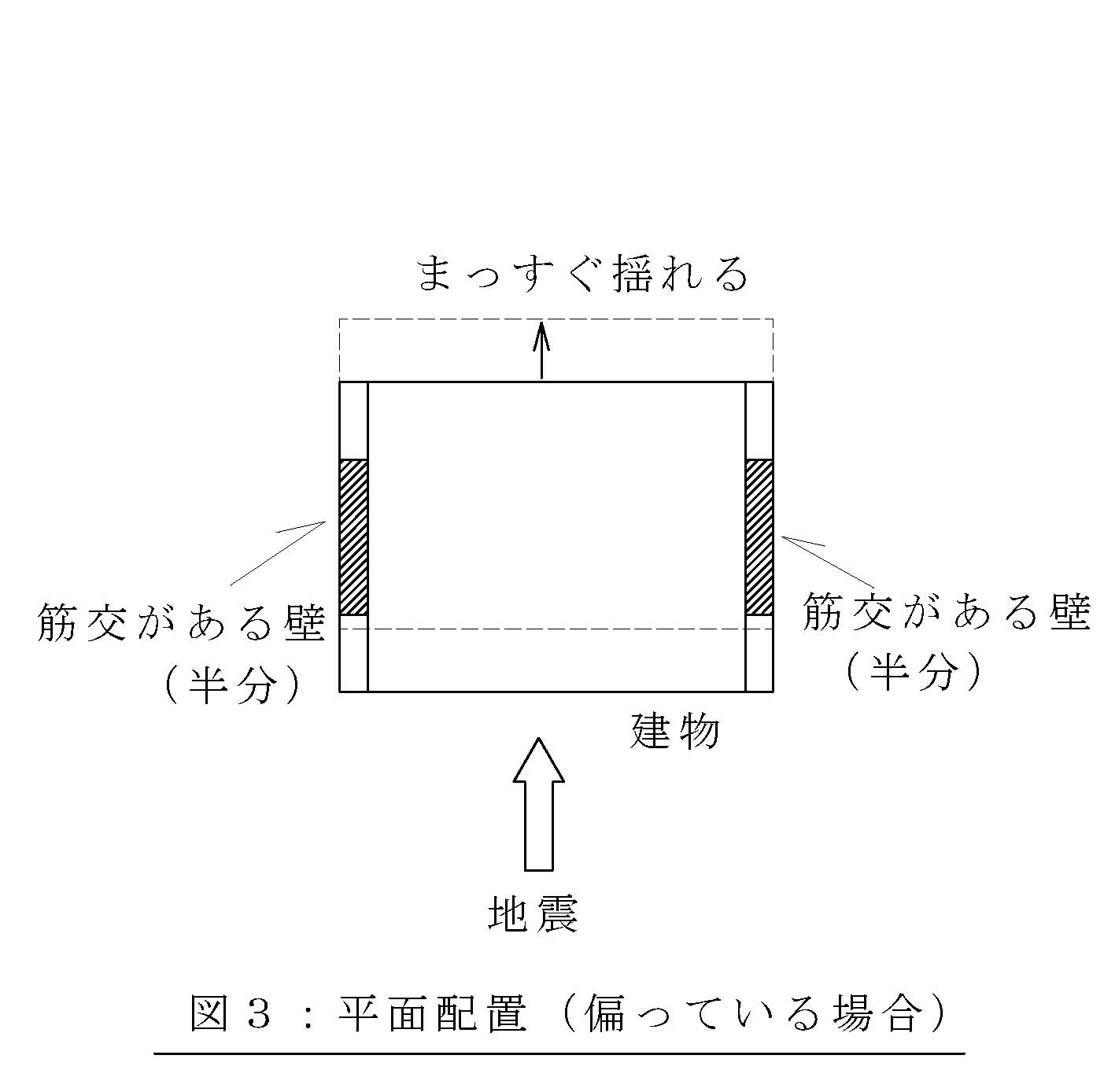 右端が硬くて動きにくいのですから、いってみれば図2の点線のように建物が揺れます。 そうすると外側だけが極端に崩壊する可能性が高くなります。