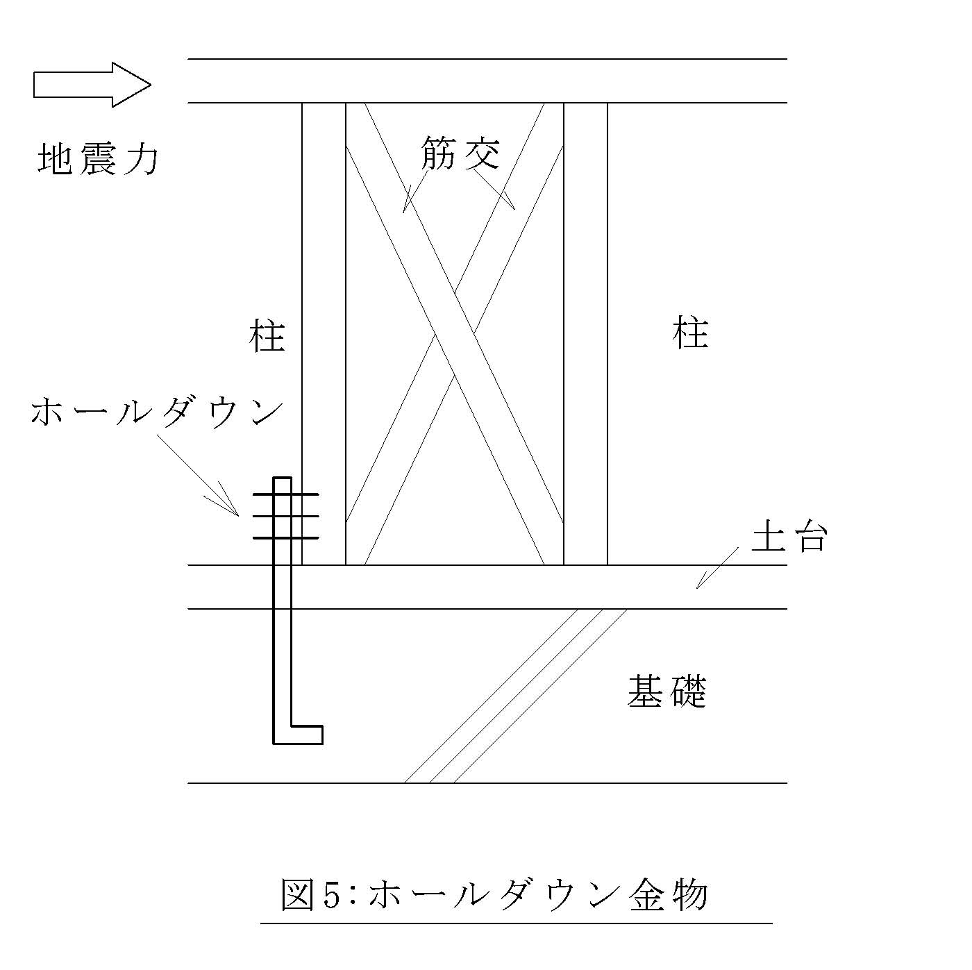 左側の柱が上側に引き抜かれるのは感覚的にわかるでしょうか?そのため、柱が抜けないように図5のように金具で柱を基礎に緊結しておくのです。これがホー