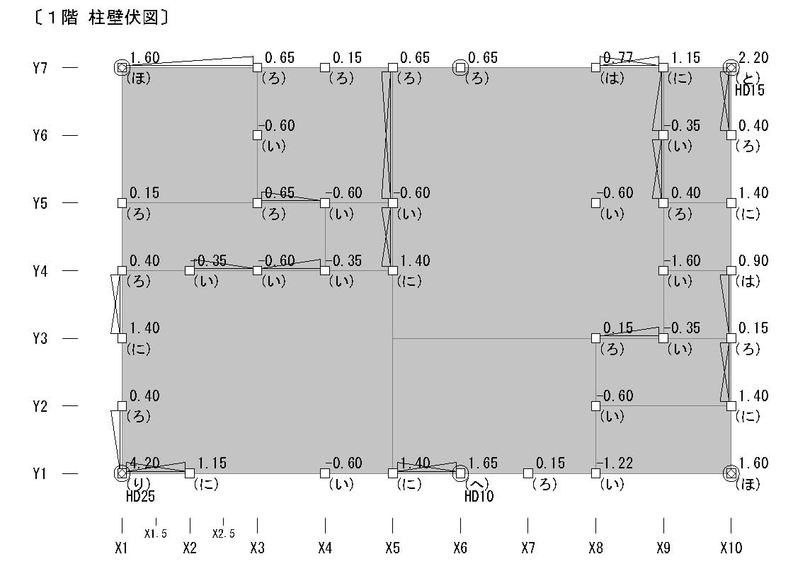 す。柱が四角で示されています。柱と柱の間に三角形があるのが筋交です。三角形が二つ重なっているのはタスキに掛けた筋交です。柱1本1本に(い)から