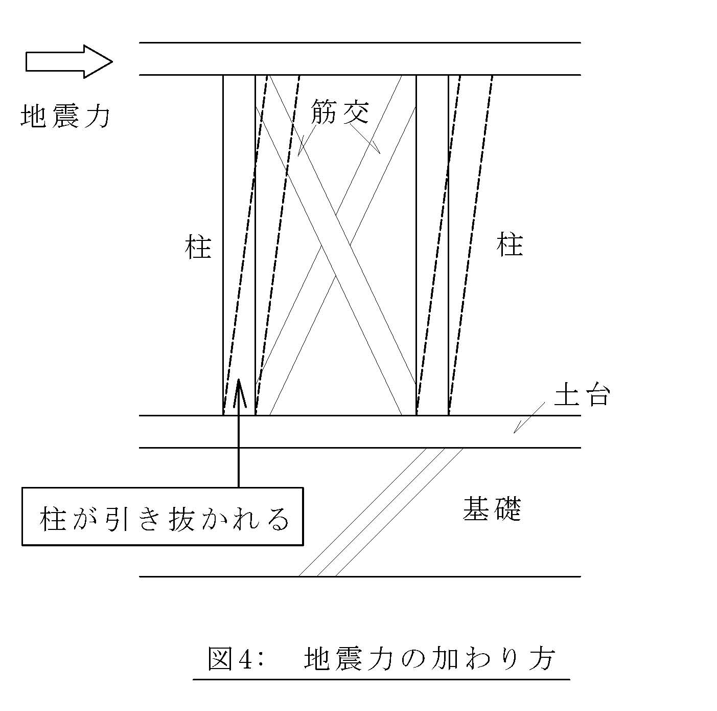 木造の建築物は、筋交を入れた壁で地震力に対抗しようとします。その時の力の加わり方を見てください(図4)。左から地震が来て、なんとか筋交で対抗を